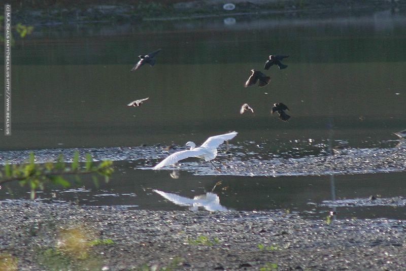 carrlake.050924 -- Snowy egret harrassed by blackbirds